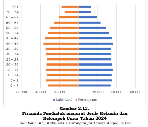 Struktur penduduk Kabupaten Karanganyar tahun 2024, berdasarkan jenis kelamin dan kelompok umur, memperlihatkan bentuk piramida penduduk yang relatif seimbang, meskipun menunjukkan kecenderungan menuju piramida stasioner. Kelompok usia produktif (15– 64 tahun) mendominasi jumlah penduduk, dengan porsi yang cukup besar baik pada laki-laki maupun perempuan. Hal ini menunjukkan bahwa Kabupaten Karanganyar memiliki potensi tenaga kerja yang besar, yang dapat menjadi modal penting dalam mendukung pembangunan daerah.