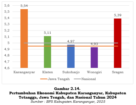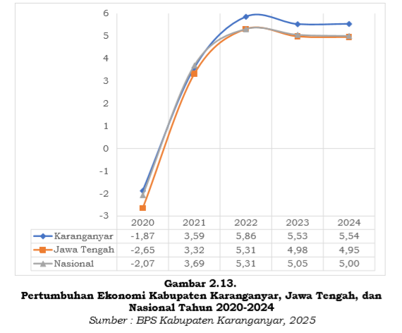 Pertumbuhan ekonomi Kabupaten Karanganyar tahun 2020 - 2024 menunjukkan dinamika pemulihan yang cukup baik setelah masa kontraksi pada tahun 2020. Pada tahun tersebut, pertumbuhan ekonomi Karanganyar mengalami penurunan sebesar -1,87%, meskipun kontraksi ini lebih ringan dibandingkan Jawa Tengah (-2,65%) dan tingkat nasional (-2,07%). Hal ini menunjukkan bahwa perekonomian Karanganyar memiliki ketahanan yang lebih baik di tengah tekanan eksternal. Memasuki tahun 2021, Karanganyar berhasil bangkit dengan pertumbuhan sebesar 3,59%, melampaui Jawa Tengah (3,32%) dan nasional (3,69%). Tren positif ini berlanjut hingga tahun 2022, di mana Karanganyar mencatat pertumbuhan tertinggi sebesar 5,86%, lebih tinggi dibandingkan Jawa Tengah (5,31%) dan nasional (5,31%). Kinerja ini menunjukkan efektivitas upaya pemulihan ekonomi di tingkat daerah, yang kemungkinan didorong oleh pemulihan sektor-sektor utama seperti industri, perdagangan, dan pertanian. Namun, pada tahun 2023 dan 2024, pertumbuhan ekonomi Karanganyar cenderung stabil di kisaran 5,53% hingga 5,54%. Meski tetap lebih tinggi dibandingkan Jawa Tengah dan nasional, laju pertumbuhan yang melambat ini dapat menjadi indikasi perlunya strategi baru untuk menjaga momentum pertumbuhan, seperti melalui peningkatan investasi, pengembangan UMKM, dan diversifikasi sektor ekonomi. Secara keseluruhan, kinerja ekonomi Karanganyar yang konsisten lebih tinggi dibandingkan rata-rata provinsi dan nasional mencerminkan potensi besar daerah ini dalam mendukung pertumbuhan ekonomi regional. Oleh karena itu, penting bagi pemerintah daerah untuk terus mendorong kebijakan yang mendukung iklim investasi, pengembangan infrastruktur, dan peningkatan kualitas sumber daya manusia agar pertumbuhan ini dapat berkelanjutan.